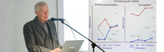 Als erstes referierte Dr. Ulrich Kutschera, Professor für Pflanzenphysiologie und Evolutionsbiologie, über "Design-Fehler in der Natur, Alfred Russel Wallace und die Gott-lose Evolution" oder anders gesagt, dem Spannungsfeld zwischen Wissenschaft und Glaube. Vom Leben und Werk des Naturforschers Alfred Russel Wallace ausgehend zeigt er in beredten Beispielen, dass die religiöse Vorstellung einer übergeordneten Intelligenz, welche die Evolution steuert, nicht mit wissenschaftlichen Erkenntnissen zu vereinbaren ist. Die Stichworte dazu sind "Zufall" und "Notwendigkeit". Mit zahlreichen Beispielen illustrierte Kutschera die vielen "Design-Fehler", demzufolge die Vorstellung eines "Naturdesigns" eine einfache Katastrophe sei und jeder Ingenieur, der solche Fehler gemacht hätte, mit Sicherheit fristlos entlassen worden wäre.
