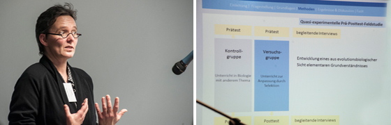 Dazu zeigte sie verschiedene Konzepte zu einer Unterrichtsreihe, wobei beispielsweise der Aspekt "Züchtung" (von Hunden, aus dem Lebensalltag der Kinder) ein geeigneter Einstieg sein könne. Andere Beispiele zeigte sie für "Anpassung", "Variation", "Zufall" und "Selektion". Die Ergebnisse zeigen signifikant, wie sich die im Unterricht anfangs nur mittlere Akzeptanz von Evolution nach dem Unterricht deutlich erhöhte. Ebenso verbesserte sich das Verständnis von Evolution, mit signifikanten Unterschieden zwischen Versuchs- und Kontrollgruppe.