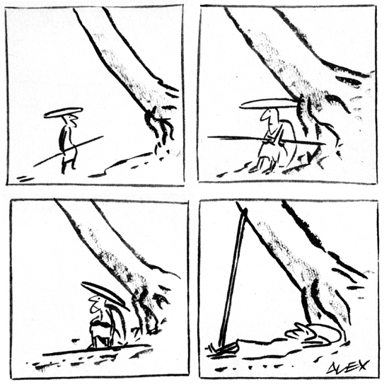 (hpd) Die Bildgeschichten des „Pilger Mu“ sind eine Kreation des Malers und Zeichners Alex Ignatius. Vier Bilder sagen manchmal mehr als viele Worte.