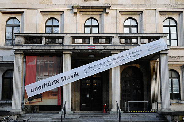 An der Fassade des ehemaligen „Führerbaus", in der die Musikhochschule untergebracht ist, stört ein 12 Meter langes, schräg angebrachtes Transparent mit der Aufschrift „unerhörte Musik" die klotzige Wucht der NS-Architektur.