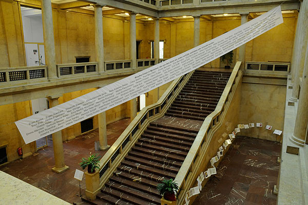 Im nördlichen Lichthof ist diagonal durch die dreistöckige Halle ein 18 Meter langes weißes Transparent mit den Namen der 106 Musiker/innen gespannt. Auf 58 Notenständern werden Porträts, Biografien, Partituren, und Dokumente der Verfolgung gezeigt.