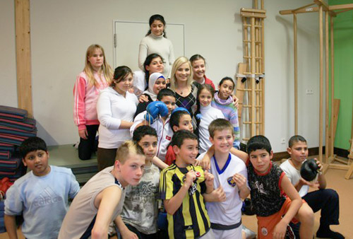 Als prominente Botschafterin unterstützt Regina Halmich, mehrfache Boxweltmeisterin, die Aktion und boxte am Nachmittag für Straßenkinder und die SchülerInnen der Klasse 5a in der Richard Grundschule.