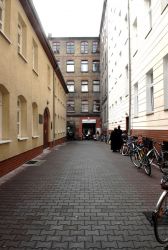 Auf die Frage, wo die Gemeinde denn bisher ihre Räume habe, wird uns eine Adresse genannt, die nur ein paar Häuser entfernt ist. Am Hofeingang ist kein Hinweisschild zu finden. An dem hinterem Quergebäude des Innenhofes ist dann das gelbe Schild unten an der Hauswand zu erkennen: Islamisches Zentrum Omar Ibn Al Khattab, 3. Stock. Durch ein typisches, enges, angeschmuddeltes Treppenhaus im Hinterhaus geht es die Treppenstufen hinauf und krasser könnte der Unterschied zum Neubau nicht sein.