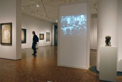 In den 1980ern wurden darüber hinaus postmoderne Themen wie gender, class und race thematisiert und boten viel Nährboden zu ironischer Kritik, Parodie und Subversion traditioneller Assoziationen. Rosemarie Trockel setzte sich zum einen durch die Wahl „weiblicher Materialien“ vom autoritären Stil Beuys sowie von dem Machismo der Kölner Kunstszene ab und arbeitete diese Materialien in einem neuen Produktionsvorgang um. Ihre Verwendung der sich wiederholenden Muster und besetzten Symbole wie etwa des Playboy-Hasen und des Hammer-und-Sichel-Symbols auf maschinengefertigten Wollbildern können als Parodie auf die Produktionsentwürfe von Mitgliedern der späten, utopistischen russischen Avantgarde angesehen werden. Im Ausklang der Ausstellung ist außerdem die zwi-schen Dresden und Westberlin entstandenen Bildschaukel „Gefrorene Bilder brechen leicht“ von Via Lewandowsky zu sehen. Die Epoche des Kalten Krieges ging am 9. November 1989 mit der Mauereröffnung zu Ende.