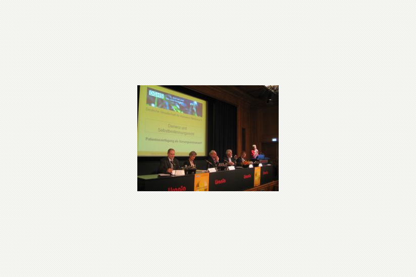Damit haben sich auf dem Podium der DGHS vier Personen auseinandergesetzt: Prof. Dr. Dieter Birnbacher ist Medizinethiker, Vorsitzender des wissenschaftlichen Beirats der DGHS und lehrt Philosophie an der Heinrich-Heine-Universität in Düsseldorf. Mit einem Impulsreferat eröffnet er die Diskussion und wies im voll besetzten Saal auf ein grundsätzliches Dilemma im Umgang mit Demenzkranken hin, das entstehe, „wenn die in der Patientenverfü¬gung geäußerten vorgreifenden Wünsche in eine andere Richtung zielen als die Bedürfnisse, die der Patient akut zu erkennen gibt.“ Denn zu Problemen in der Umsetzung einer Patientenverfügung kommt es in der der Regel nur, wenn sich z. B. Angehörige und Ärzte nicht einig seien. Er stellte stellt die für Philosophen wichtigste Frage: „Ist die unterzeichnende Person dieselbe wie die Betroffene?“ und beantwortet diese mit einem klaren „Ja“. Für ihn steht die Selbstbestimmung des Patienten an erster Stelle.