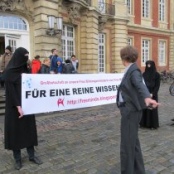 MÜNSTER. (hpd) Vorgestern weihte Bildungsministerin Annette Schavan das Zentrum für Islamische Theologie Münster/Osnabrück ein. Das nahm eine Gruppe von Musliminnen, die sich Free Minds nennt, zum Anlass, eine kreative Aktion in Form einer "Grußbotschaft" an die Ministerin zu richten. Free Minds will Missstände des Islam nicht weiter verschweigen, sondern diese öffentlich thematisieren.