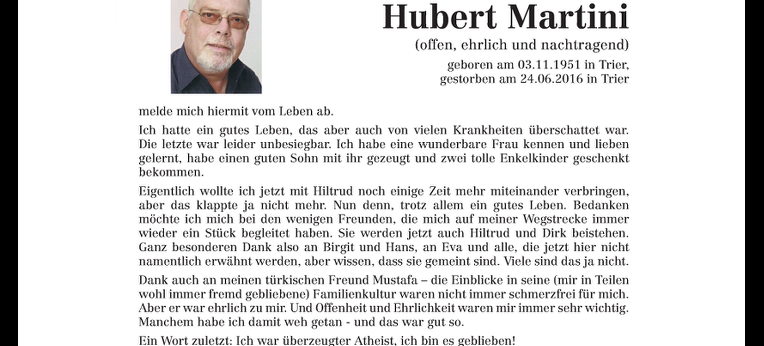 TRIER. (hpd) Die Todesanzeige eines Trierer Atheisten bewegt das Netz. Unkonventionell und ohne Blatt vor dem Mund verabschiedet er sich von seinen Angehörigen.