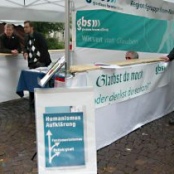 HEIDELBERG. (hpd) Der neue GBS-Infostand wurde am vergangenen Samstag (2. Oktober) in der Heidelberger Fußgängerzone (Hauptstrasse) eingeweiht. Ein Versuch des ‚Regengottes’, dessen Aufbau schon früh morgens zu erschweren, konnte keine(n) der beteiligten säkularen Humanist(inn)en davon abhalten, zügig und engagiert den Stand fertig zu stellen und das Gespräch mit den Passanten zu suchen.
